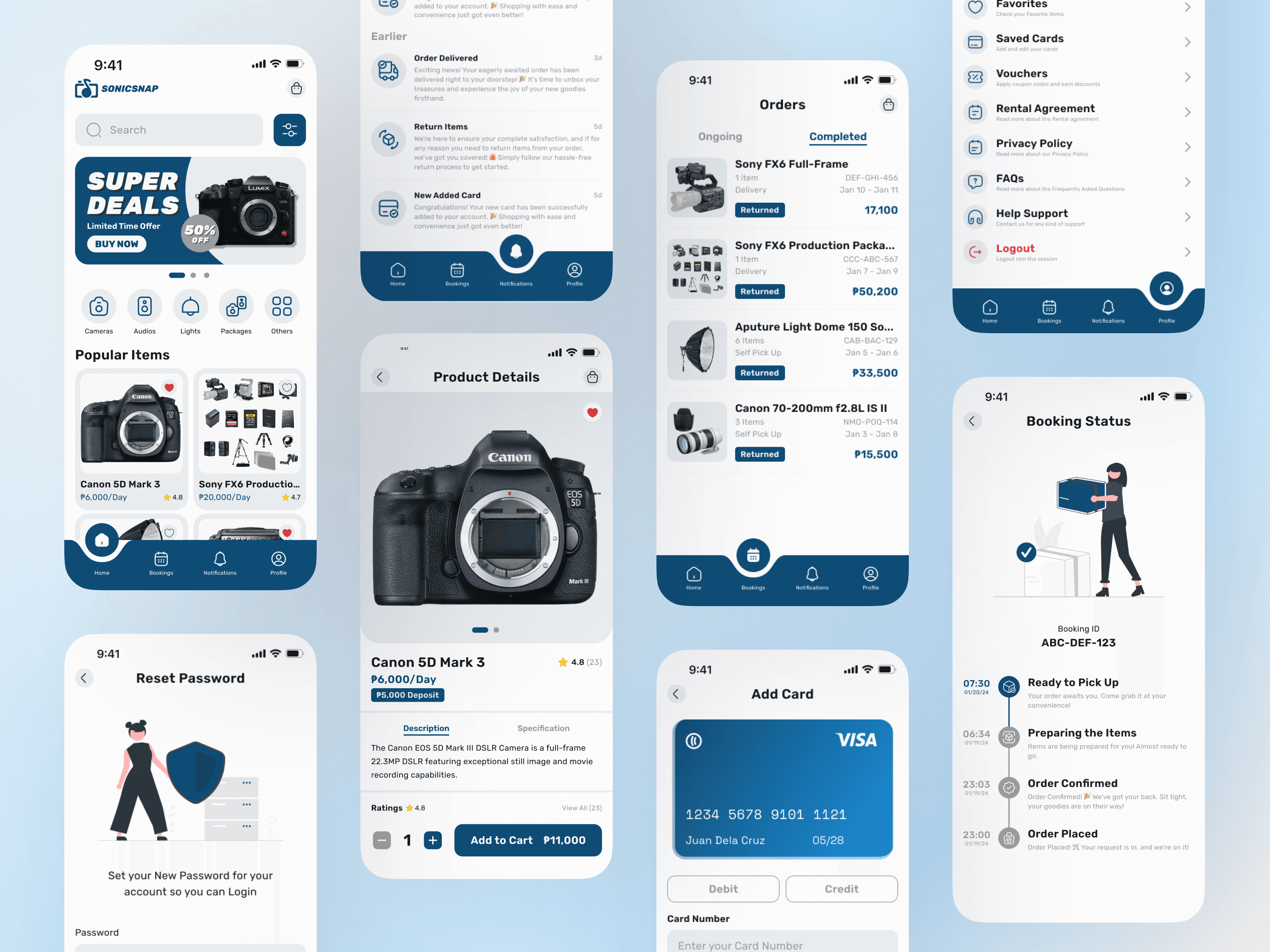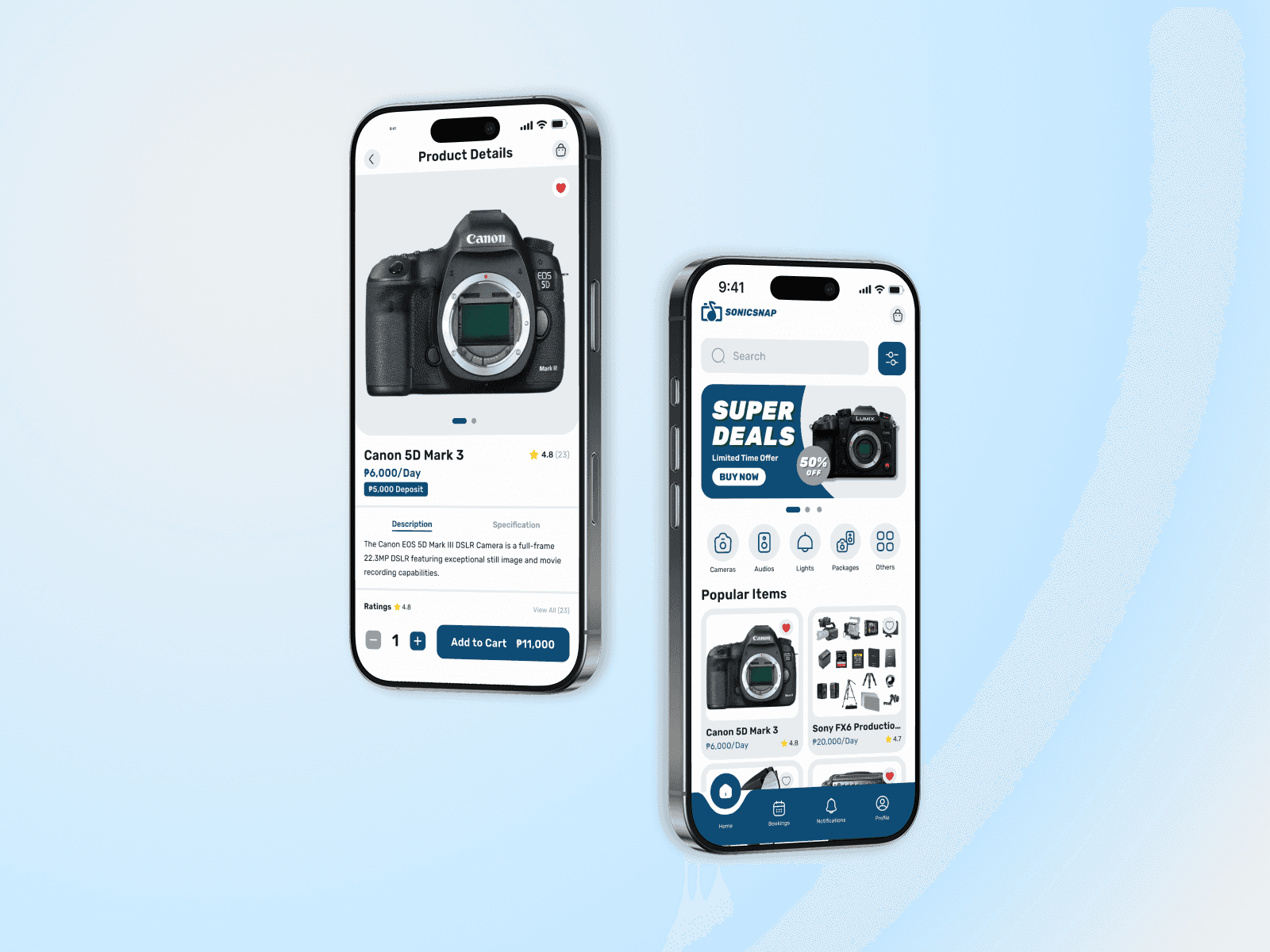 The SonicSnap app showcases a highly polished UI, featuring a sleek, modern aesthetic and intuitive design elements that instill trust and clarity. It delivers an elevated UX through frictionless equipment rental processes, ensuring a remarkably reliable and easy user journey from selection to booking.
